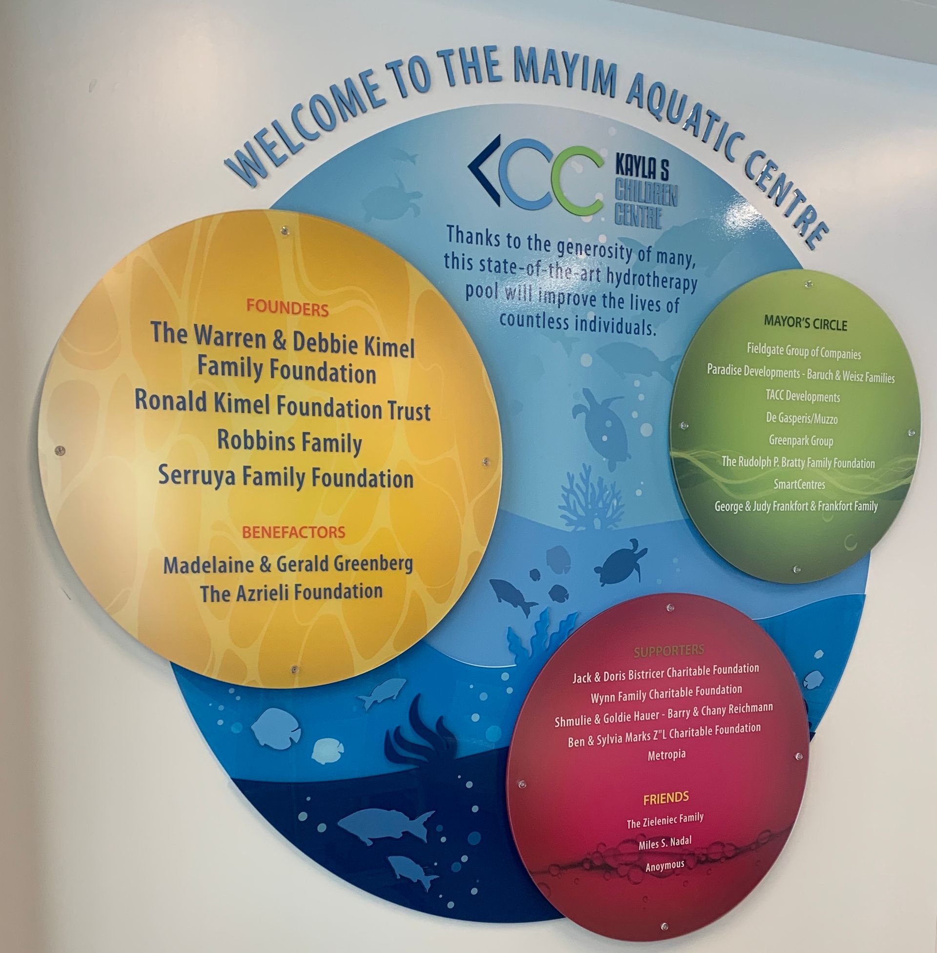There were many donors to thank, and a number of donation levels to recognize. The scope of work for the project included three exterior naming opportunities, including the building itself and the pool, interior naming, room dedications and an updateable donor wall. BAS collaborated with Kayla’s to create a system that coordinated with the signage already in place for the school, yet with its own distinct look. As with the existing signage the design approach was bright and playful to reflect the children who will enjoy the facility.